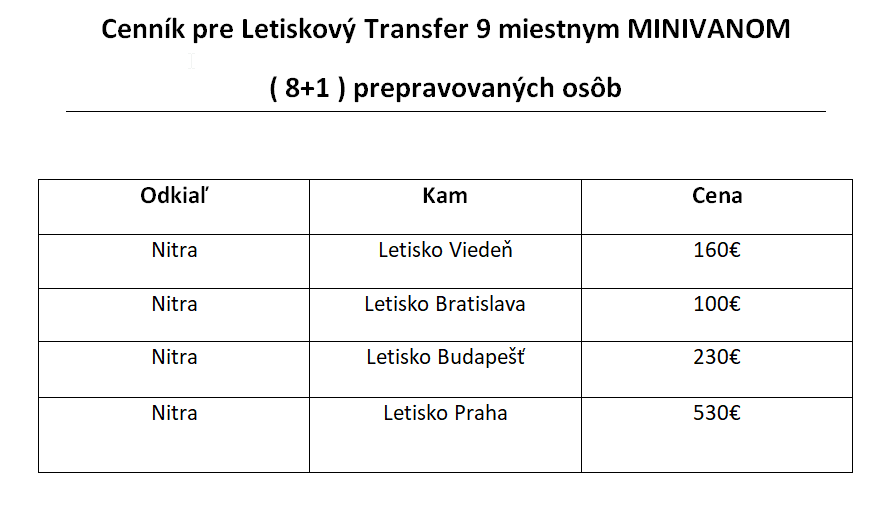 Letiskový Transfer a preprava osôb 9 miestnym Minivanom (8+1) osôb